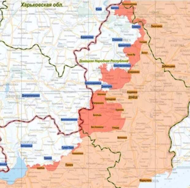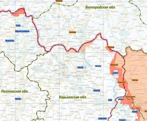 В Харьковской области российская армия занимает небольшой район у границы с Белгородской областью в районе Волчанска и немного западнее, ближе к трассе Белгород — Харьков, район харьковского села Меловое (близ белгородских Валуек) и далее более обширную зону у границ с ЛНР, там почти взят в кольцо Купянск. В этой республике под контролем Украины остается небольшой участок на границе с Харьковской областью и ДНР, согласно карте.