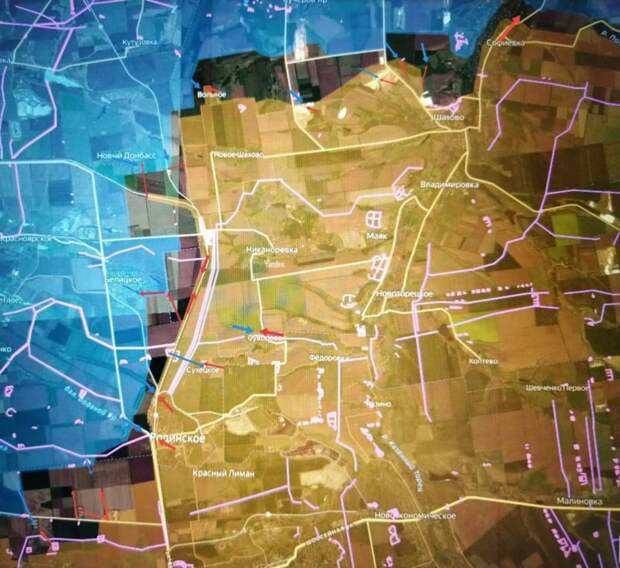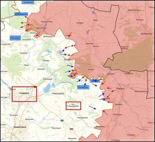 ВС РФ пытаются обойти и инфильтроваться в Красный Лиман малыми группами. Обстановка осложняется сложной логистикой для ВФУ из-за широкой зоны активного применения БПЛА. В районе Александровки подразделения ВС РФ продвинулись в лесном массиве и вышли к юго-восточной части населённого пункта, а также подошли к административной границе Яровой с западной и восточной сторон. Со стороны Пинькова Яра ВС РФ пробиваются к северной окраине Красного Лимана в обход Ставков, идут бои в районе фермерского хозяйства. В Ильичёвка (Озёрном) ВС РФ продвигаются в северной части населённого пункта, бои продолжаются на юге Дибровы. Северо-западнее Дибровы подразделения ВС РФ расширили зону контроля в лесных массивах, продвинулись в направлении Старого Каравана и Брусовки. Позиции противника зачищаются.