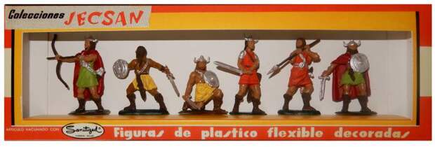 Правда, сейчас начался новый выпуск солдатиков под этим брендом. То же можно сказать и о испанской компании «Jecsan», в 50-80 гг. ХХ века лидера производства солдатиков в Испании наряду с «Reamsa». В набор викингов Jecsan входило 12 фигурок, цветных, из резины, при этом в тот период шлемы были съемными. Все воины, производимые с 1959 г., имели размер 60 мм. Впоследствии стали выпускаться из одноцветного пластмасса, а затем ПВХ. Конечно, все они были с рогами, «потребитель» бы не понял другого вида викингов.