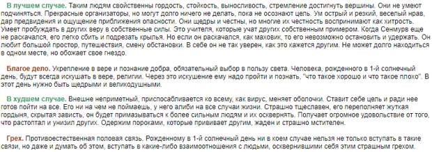 Укрепление в вере и познание добра, обязательный выбор в пользу Света. Человека, рожденного в 1–й солнечный день, будут всегда искушать в вере, религии. Через это искушение ему надо пройти и познать, "что такое хорошо и что такое плохо". В этот день нужно быть щедрыми и великодушными.