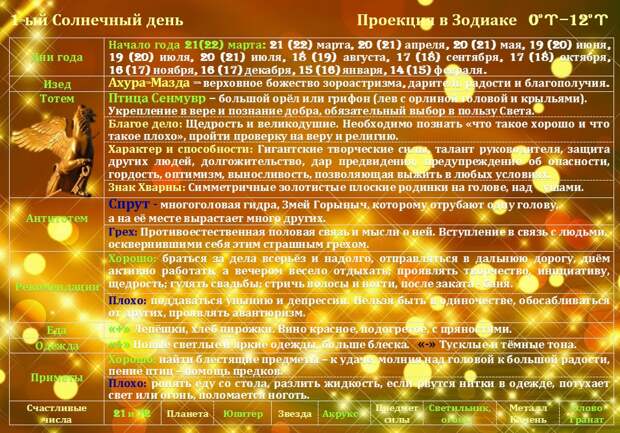 1–й солнечный день благоприятствует людям, которые ведут других людей, для Учителей, начальников. В книге Р. Зенера “Учение магов” сказано – “Пей вино и веселись”, так как этот день связан с коллективным началом. Утро и день ты должен посвятить большой работе, а вечер проводи в кругу друзей, активно расслабляйся, пей вино, ешь и веселись. Запрещается поддаваться унынию. Не везет тем, кто находится в состоянии депрессии, тем, кто теряет надежду. Везет оптимистам. Надо проявлять веселье и радость, но не идиотскую. В этот день нужно обязательно проявлять творческое начало, инициативу. Надевать новые одежды, но не покупать. День открытых настежь дверей, или хотя бы окон. Нужно проветривать больше помещений. Нужно печь лепешки, хлеб, пирожки. И закусывать этими пирожками вино. Кто не пьет вина вечером дня Хормазда, тот не уважает самого Творца. Вино должно быть обязательно красное, подогретое с пряностями и медом – глинтвейн. Основная рекомендация: в первой половине дня – очень интенсивно работать, производить что–то, во второй половине – пить, гулять и веселиться.
