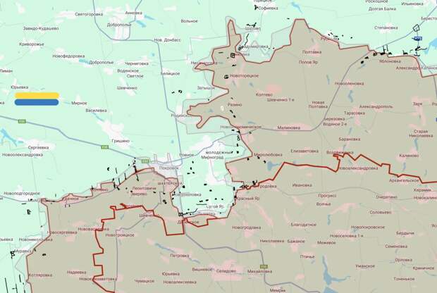Последнюю неделю противник предпринимает отчаянные попытки исправить ситуацию в Красноармейске и Мирнограде (Димитрове). На наших схемах и картах каналов противника видно, что оперативное окружение гарнизонов ВСУ достигает 10 км глубиной, а «горлышко» в данном мешке не превышает 5 км.
