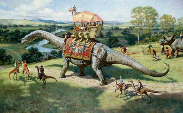 Конечно, человек на большинстве рисунков всё-таки меньше динозавра — но разница не так уж велика, как, к примеру, между современным человеком и динозавров, жившим 100 миллионов лет назад.
