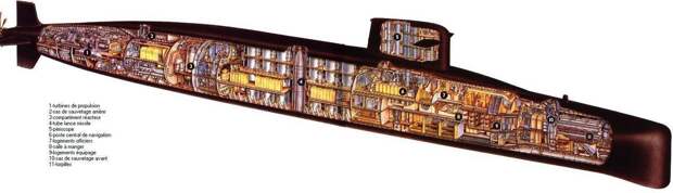 Лодка интересна тем, что, в отличие от американской ПЛАРБ «Лафает», имела не шесть, а семь отсеков. Для обеспечения безопасности ЯЭУ размещалась в отдельном отсеке.