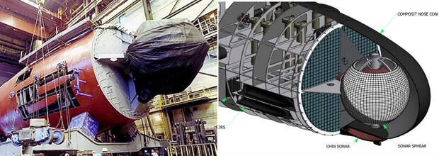 Известно, что носовая часть лодки полностью отведена под гидроакустический купол, что предполагает использование очень большого конформного полотна гидроакустической решётки в носовой части ПЛАРБ.