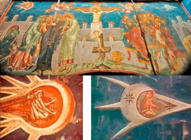 Ангелы летящие в небе, фрагмент фрески «Распятие» из сербского православного монастыря Високи Дечани в Косово, Югославия (фреска создана около 1350 года).
