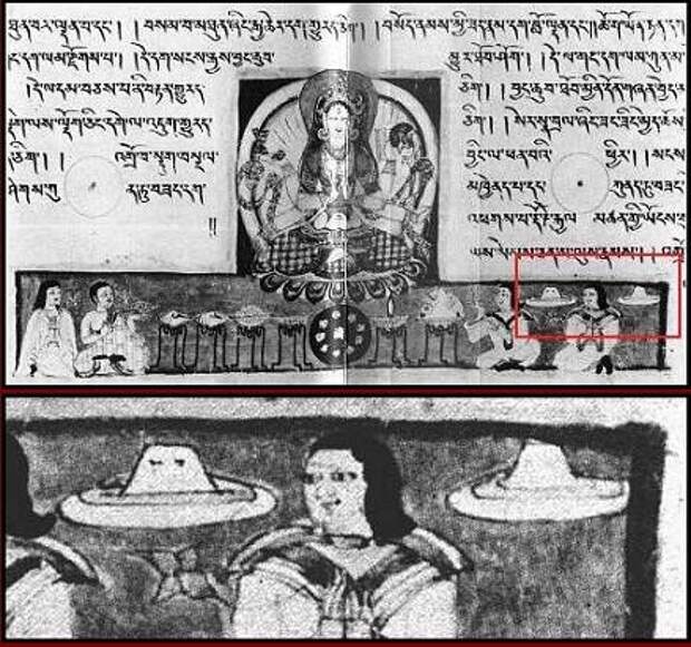 Это фрагмент Тибетского перевода санскритского текста “Prajnaparamita Sutra”, датируемая 10-м веком и хранящаяся в японском музее. Виманы, которые Вы видите в правом нижнем углу удивительно напоминают современные НЛО.