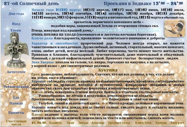 В 27–й солнечный день нельзя задавать дурацкие вопросы. В этот день нельзя опускаться под землю, в шахты; метрополитен небезопасен в этот день. Кстати, многие аварии в метро происходили в 27–й солнечный день. Шахтеры в этот день раньше отдыхали. Если в этот день приходится быть в метро, или в душном, спертом помещении – считается, что там нужно меньше разговаривать. Это день странных случайностей, вы можете притянуть к себе странные случаи, совпадения, обращайте на это внимание, это все указывает на перемены в жизни. Будьте готовы к резким переменам, неожиданностям.