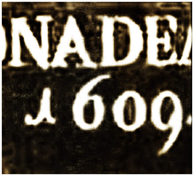 Тут уже трудно утверждать о том, что первый знак в надписи это цифра. Есть возможность сравнить с настоящей цифрой "раз". Она написана между двумя "пятёрками" а первый знак - несомненно латинская "И". Так шестой век превратили в шестнадцатый.