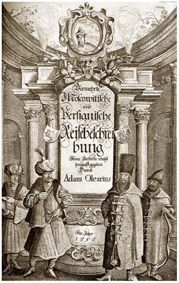 Титульная страница книги Адама Олеариуса "Описание путешествия в Московию". Русские костюмчики просто блеск!
