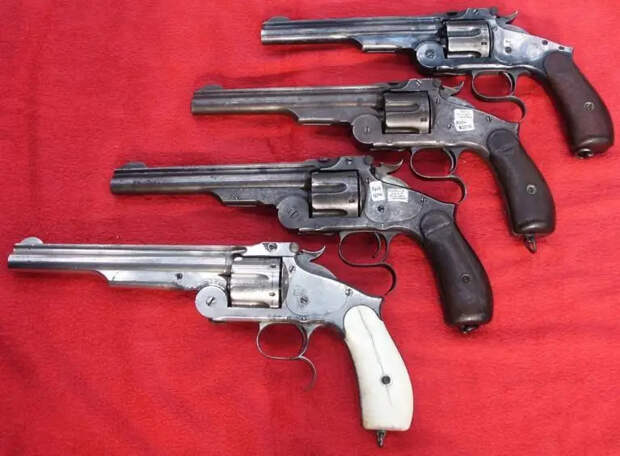 Револьверы «Смит и Вессон» калибра 10,67-мм, находившиеся на вооружении российской императорской армии с 1871 по 1895 гг. Сверху вниз: 1-ая (1871), 2-ая (1872) и 3-я (1880) модели и модель для коммерческой продажи.