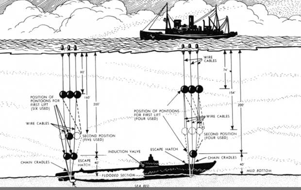 Напомню, что Курск затонул на глубине 110 метров, но габариты лодки были несопоставимы с USS Squalus – длина 154 метра, ширина 18, высота до аварийного люка около 15 метров.