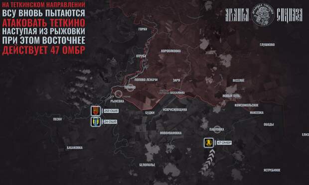 На Тёткинском направлении обстановка стабильная, но при этом активность противника повысилась. В Рыжевке противник активно атакует в направлении Тёткино. На южной окраине села то и дело появляются штурмовые группы 253-й штурмовой бригады. При этом поддержку в наступлении оказывают миномётные расчёты 24-й штурмовой бригады, а также истребители F-16, которые в последние дни интенсивно бьют по всему фронту.