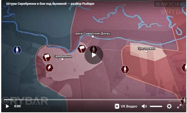 Ход боёв на подступах к Северску. 16 августа штурмовики 7-й мотострелковой бригады прорвались в западную часть Серебрянки и подняли над селом государственные флаги. Пока что уверенно закрепиться на его территории у них не вышло, сейчас здесь идут бои. К 19 августа российские войска зачистили лесополосы на участке между Григоровкой и Верхнекаменским, бои на котором шли более месяца. Параллельно с этим на южном фланге российские подразделения выбили противника из опорных пунктов в лесном массиве к юго-востоку от Выемки.