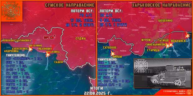 На Харьковском направлении в Волчанске, на левом берегу реки Волчья и в лесу возле Синельниково, продолжаются ожесточённые бои, противник засел в обороне и пытается сдержат натиск наших бойцов. На Хатненском участке фронта так же идут интенсивные бои, есть продвижения. Наши подразделения продолжают расширять плацдарм на левом берегу реки Волчья, за сутки общее продвижение составило до 200 метров. Противник атакующих действий не проводил. В лесу западнее Синельниково штурмовые группы «северян» продвинулись на 150 метров и заняли опорный пункт противника.
