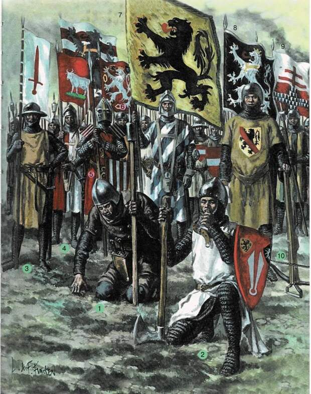 Множество странных обычаев существовало в среде воинов в прошлом. Например, здесь показан ритуал касания губами родной земли, в каковом участвовали фламандские ополченцы накануне битвы при Куртре. Позади самые разные знамёна: ткачей (6), Фландрии (7), города Гента (8), Ипра (9). Арбалетчик (10) несёт на груди герб Жана Намюрского, а раз так, значит, он «его человек», вооружён и одет на его деньги. Иллюстрация из книги Лилианы и Фреда Функенов «Энциклопедия вооружения и военного костюма. Средние века. Эпоха Ренессанса: Пехота. Кавалерия. Артиллерия. М.: Астрель, 2002, С. 110
