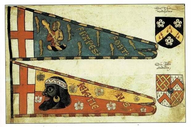 Штандарты английской знати (первая половина XVI столетия) отличались тем, что каждый из них, чтобы на нём не изображалось, имел крест Святого Георгия возле самого древка. Иллюстрация из книги Стивена Слейтера «Геральдика. Иллюстрированная энциклопедия», Эксмо, 2006 г. С. 31