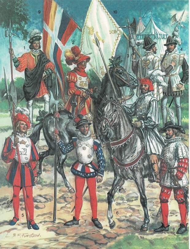 Именно короли и высшая знать создали прецедент форменной одежды в армии, когда в одинаковую одежду и с одинаковой символикой начали одевать солдат своей личной гвардии. На этой иллюстрации вы видите: дворянина гвардии Франциска I, 1520 г. (1), всадника гвардии Франциска I, 1520 г. (2), шотландских лучников Генриха II, 1559 г. (3-4), французского и шотландского лучника гвардии Франциска I, 1520 г. (5-6), французского и шотландского лучника гвардии Генриха III, 1580 г. (7-8), штандарт Франциска I, 1515-1547 гг. (9), штандарт Генриха II, 1547-1559 гг. (10). Иллюстрация из книги Лилианы и Фреда Функенов «Энциклопедия вооружения и военного костюма. Средние века. Эпоха Ренессанса: Пехота. Кавалерия. Артиллерия. М.: Астрель, 2002, С. 13