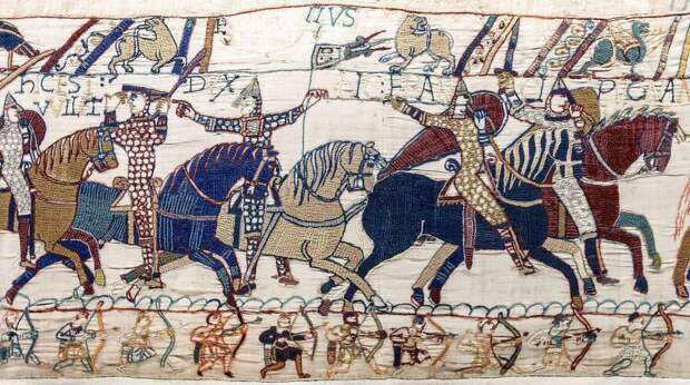 Сцена на «Байёской вышивке», изображающая момент боя, когда герцог Вильгельм снимает шлем, чтобы его узнали, а граф Юстас с флагом в руке указывает на него и кричит: «Вот он, Уильям!»