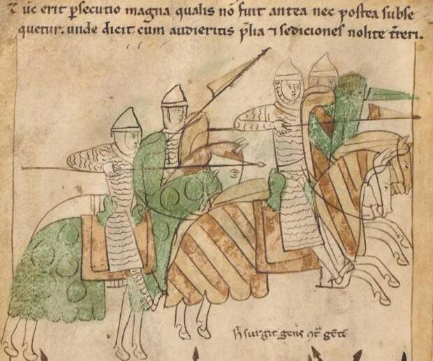 Вот, например, как выглядели такие флажки-вымпелы на копьях испанских рыцарей эпохи Реконкисты. «Памплонская иллюстрированная Библия и житие Святых», 1200 г. (Университетская библиотека Аугсбурга)