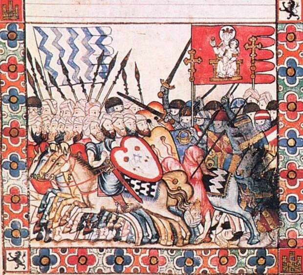 Испанские рыцари под знаменем с изображением Мадонны гонят мусульман-арабов. Иллюстрация из манускрипта «Песни Святой Марии», 1284 г. (Королевская библиотека Эскориала, Мадрид)