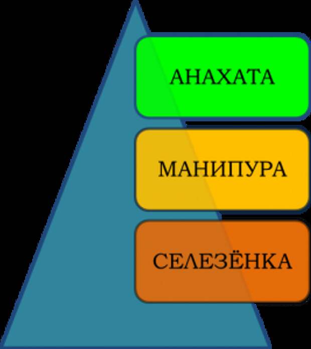 Данный треугольник на физическом уровне связан с эндокринными железами: селезёнка и Манипура – с поджелудочной железой, сердечный центр с вилочковой железой, которые при неправильном использовании пранической энергией, функционируют с определёнными нарушениями – дисфункцией. Во многом, недостаток или избыток гормонов панкреатической и вилочковой желёз обусловлен именно этим энергетическим обменом. Хотя на недостаточную/избыточную секрецию и/или функцию влияют и другие факторы: спинальные/позвоночные проблемы (искривления, сдавления и пр.), а также образ жизни человека – питания, труда/отдыха, психосоматические заболевания.
